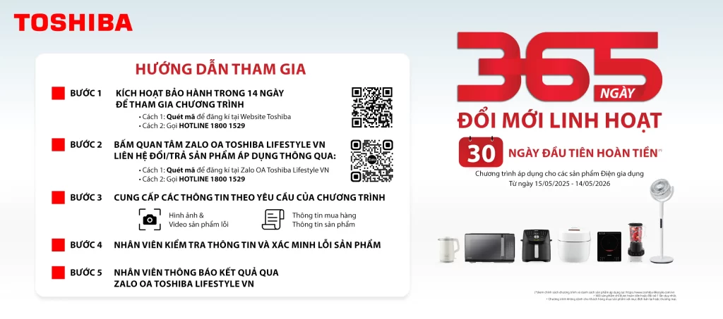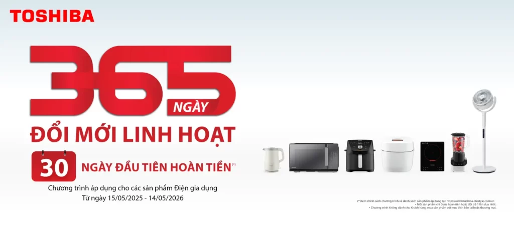 Với mong muốn mang đến sự an tâm tuyệt đối cho người tiêu dùng, Toshiba Lifestyle Việt Nam triển khai Chương trình 365 NGÀY ĐỔI MỚI LINH HOẠT dành riêng cho dòng sản phẩm Điện gia dụng Toshiba chính hãng. Đặc biệt, khách hàng còn được HOÀN TIỀN 100% trong vòng 30 ngày đầu tiên nếu sản phẩm bị lỗi.