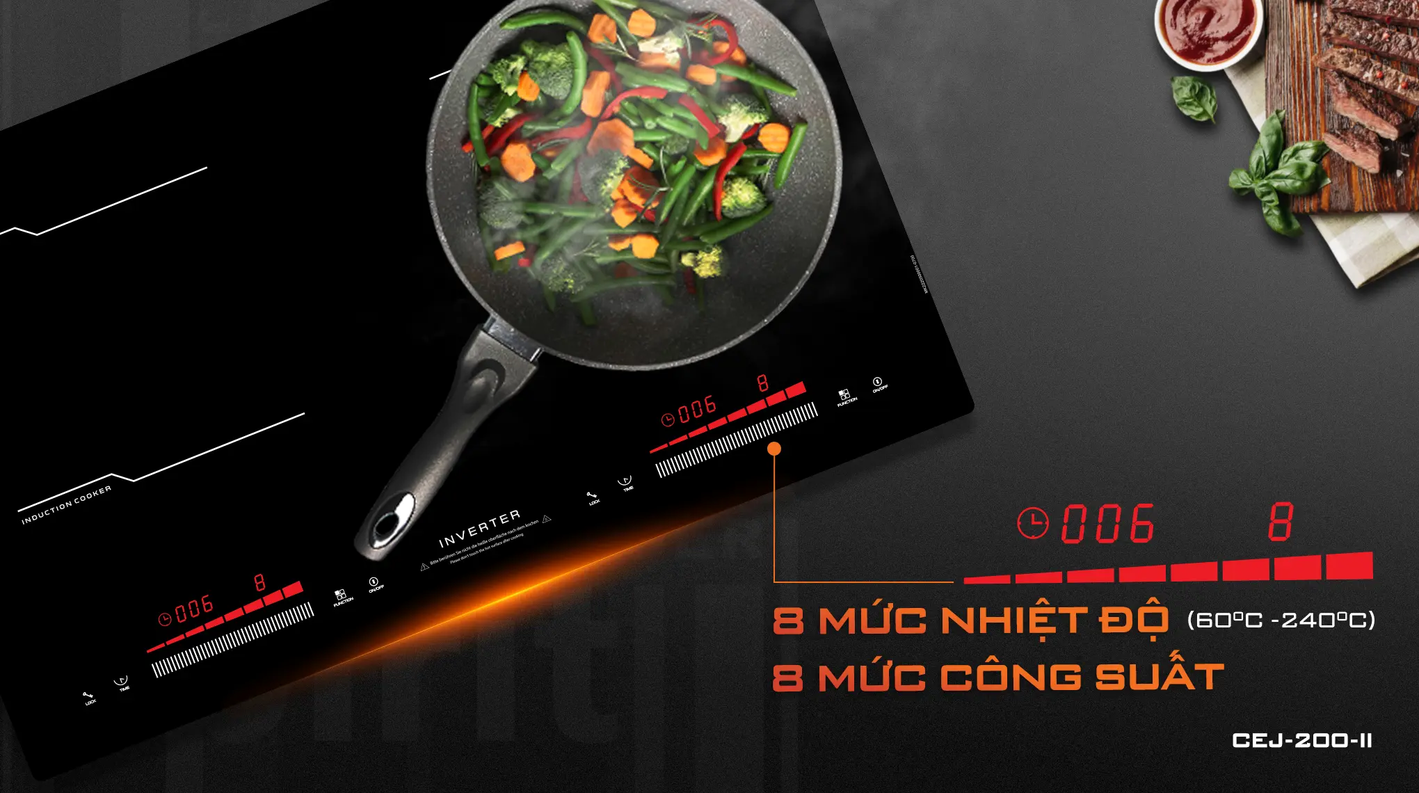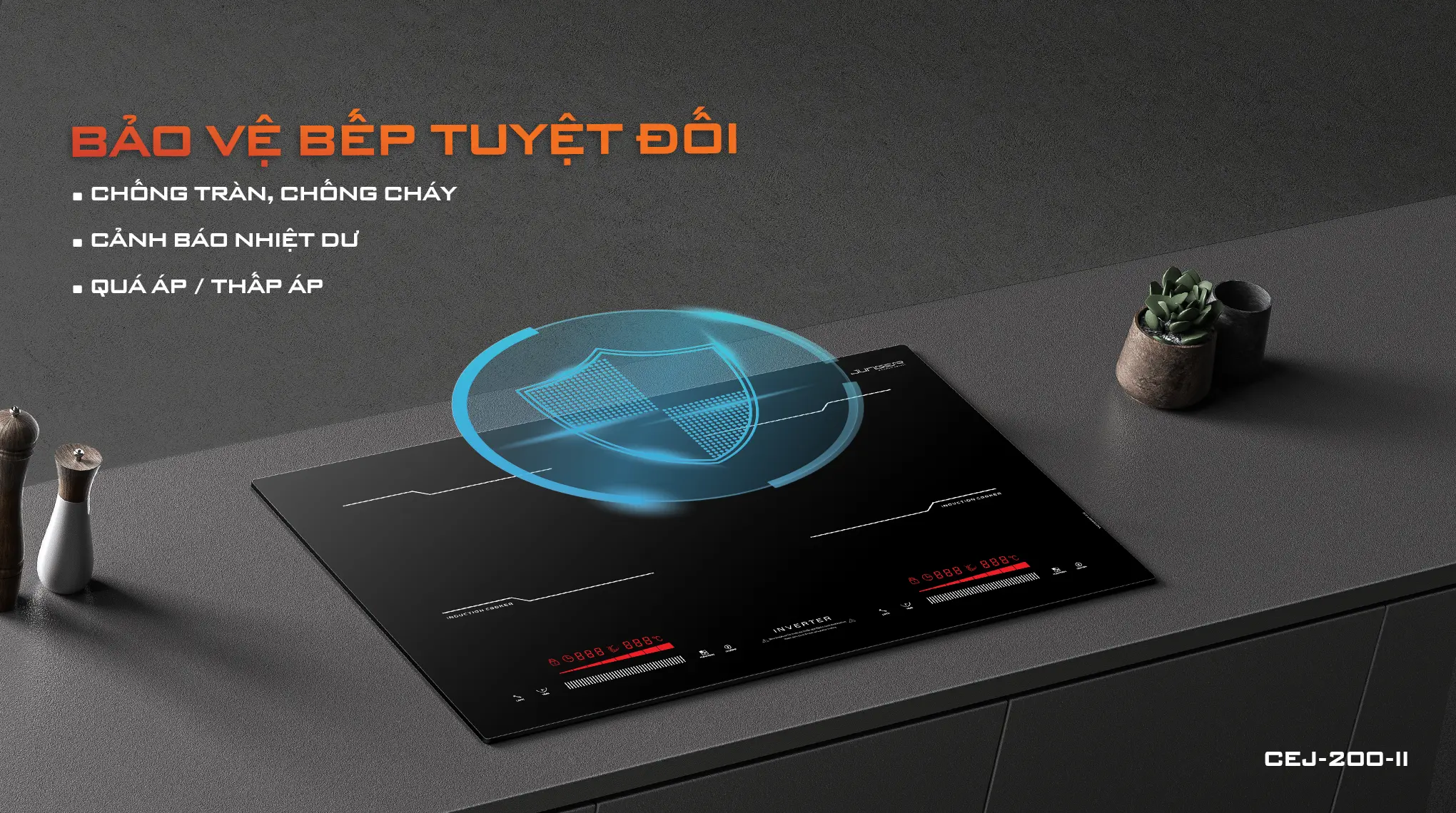 Bếp từ đôi Junger CEJ-200-II sở hữu thiết kế 2 vùng nấu độc lập giúp bạn nấu nướng nhiều món ăn cùng lúc, tiết kiệm thời gian nấu nước hiệu quả để tận hưởng những khoảnh khắc sum vầy bên gia đình.