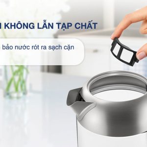 Bình đun siêu tốc tích hợp bộ lọc vi lưới có thể tháo rời nằm trên vòi có tác dụng trong việc giữ lại các hạt cặn vôi siêu nhỏ cỡ 200 micrômét để đảm bảo nước được rót vào cốc là nước sạch.