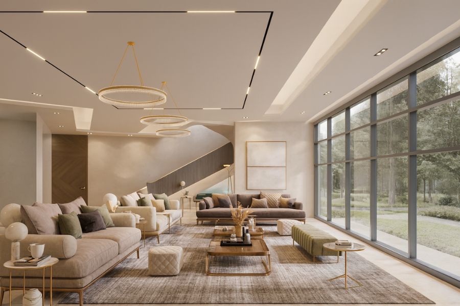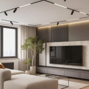 - Phòng khách: Kết nối thanh ray ở các góc trần, cho ánh sáng chạy liền mạch bao quanh không gian, làm nổi bật nội thất và tạo cảm giác hiện đại.