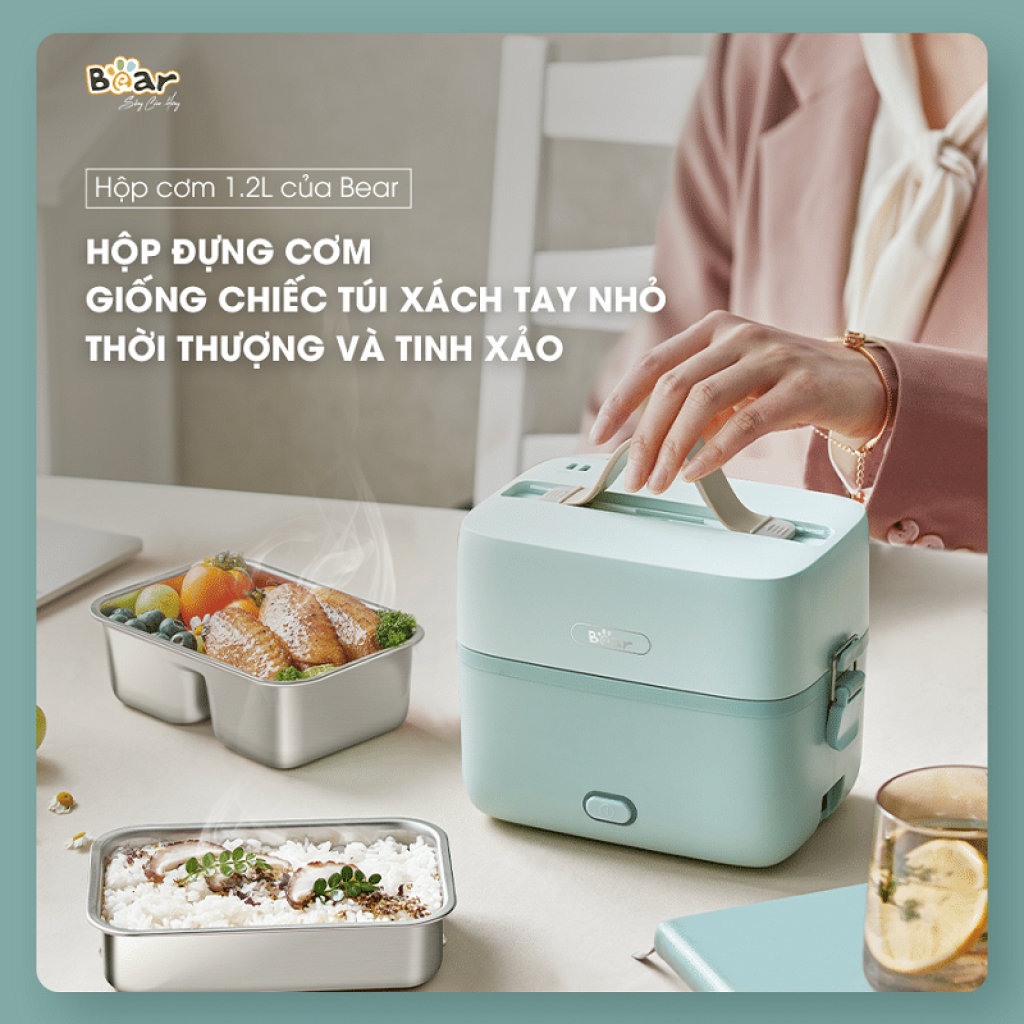 – Kiểu dáng thanh lịch: Hộp cơm điện Bear có kiểu dáng nhỏ gọn như một chiếc túi xách tay, nhẹ nhàng và tiện lợi không chiếm quá nhiều diện tích. Sự đột phá về kiểu dáng của hộp cơm điện, giúp người dùng tối ưu hóa không gian và dễ dàng mang theo khi di chuyển.
