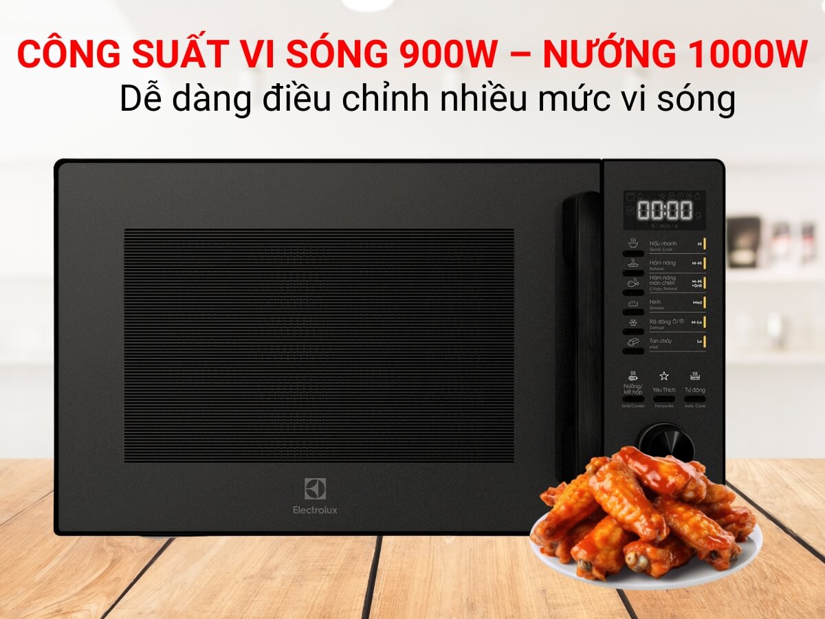 – Lò vi sóng có nướng này có công suất vi sóng 900W, công suất nướng 1000W. Công suất được chia thành 5 mức phù hợp với các chức năng rã đông, hâm nóng, nấu,…