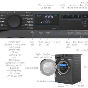– Bảng điều khiển đặt phía trước với cảm ứng kết hợp núm xoay, hỗ trợ song ngữ Anh – Việt và tích hợp màn hình LED, giúp thao tác điều chỉnh nhanh chóng và dễ dàng.