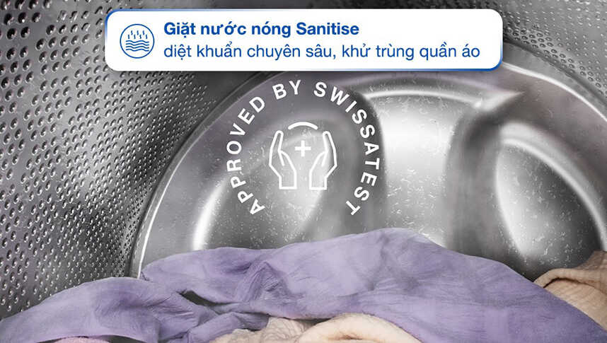 Ngoài ra, máy còn hỗ trợ tùy chọn giặt nước nóng hoặc giặt sơ, giúp loại bỏ bụi bẩn và vi khuẩn một cách tối ưu tùy theo nhu cầu thực tế.