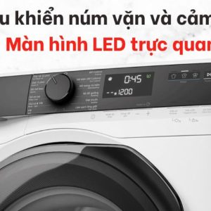 Máy giặt thiết kế cửa trước – lồng ngang, với vỏ kim loại sơn tĩnh điện chắc chắn, tạo cảm giác bền bỉ và hiện đại. Cửa máy được làm từ nhựa ABS kết hợp kính cường lực trong suốt, vừa sang trọng vừa tiện lợi cho việc bỏ và lấy quần áo. Bảng điều khiển song ngữ Anh – Việt tích hợp núm xoay, cảm ứng và màn hình hiển thị trực quan, giúp bạn dễ dàng lựa chọn chương trình giặt phù hợp chỉ trong vài thao tác.