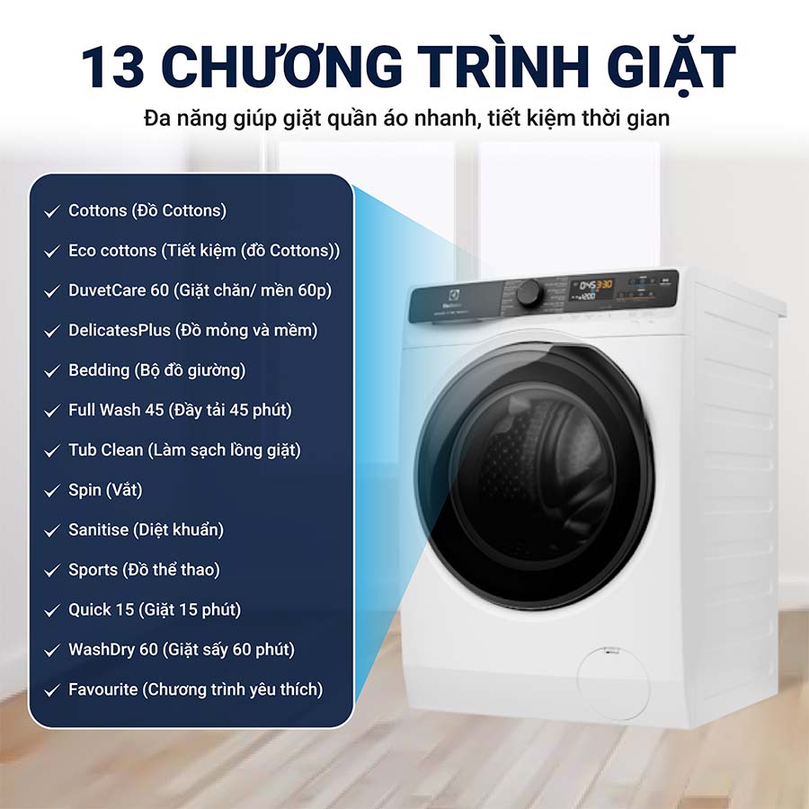 – Tính năng thêm quần áo khi đang giặt của máy giặt sấy Electrolux cho phép thêm quần áo trong khoảng 5 – 15 phút đầu tiên khi lồng giặt chưa có nước, giúp người dùng tiết kiệm thời gian, không cần phải chờ đến lần giặt tiếp theo, giảm lượng điện năng tiêu thụ cho gia đình bạn.