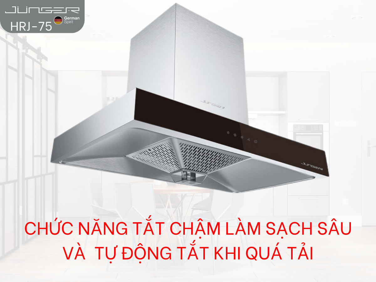 - Tính năng tắt chậm: Sau khi nhấn nút tắt nguồn, Junger HRJ-75 sẽ tiếp tục hoạt động trong 3 phút tiếp theo để loại bỏ hoàn toàn mùi thức ăn còn sót lại sau quá trình đun nấu. Hết thời gian 3 phút, máy sẽ tự động ngắt mà không cần tiếp tục nhấn phím tắt lần 2.