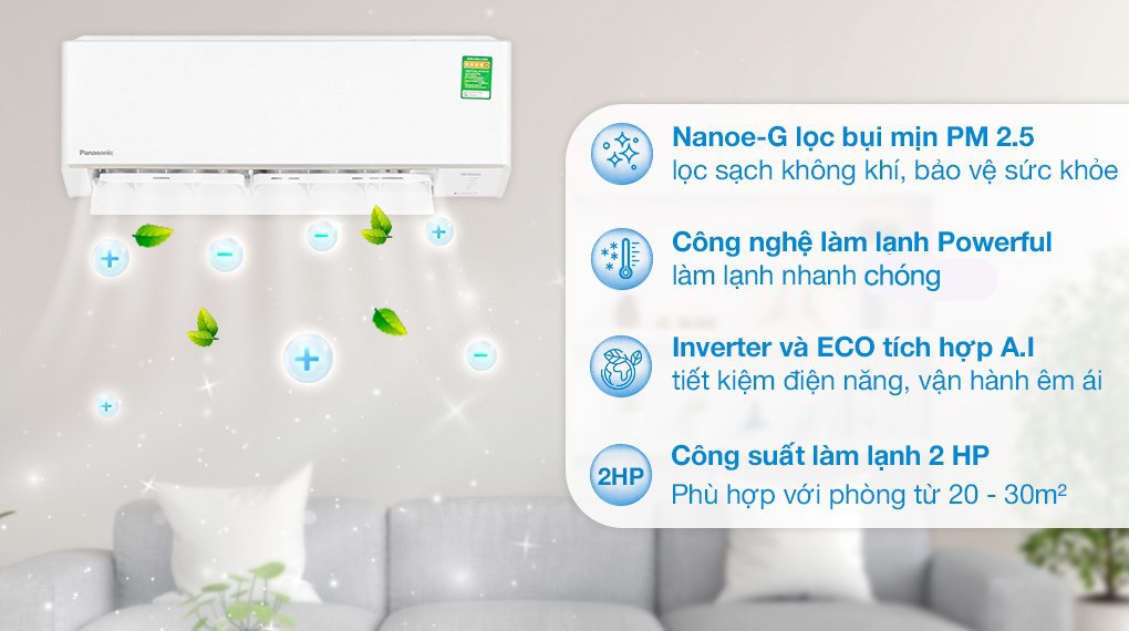 Công nghệ Nanoe-G kháng khuẩn khử mùi vượt trội giải phóng 3 ngàn tỷ hạt siêu nhỏ giúp làm sạch đến 99% vi khuẩn, vi rút, nấm mốc và khử mùi, loại bỏ các vi sinh vật có hại, giúp mang lại không khí trong lành, sạch sẽ bảo vệ sức khỏe cho những người thân yêu nhất.
