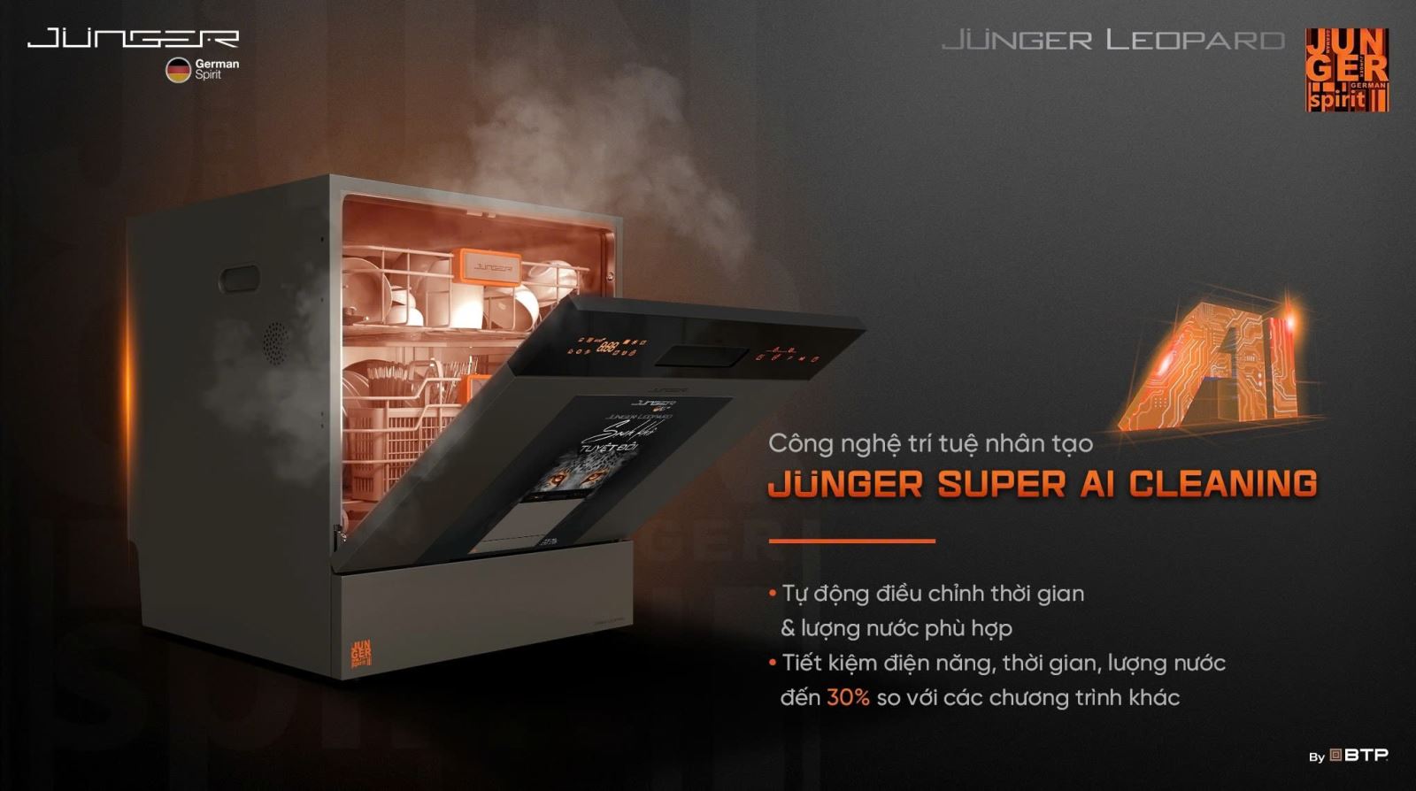 Với nhãn năng lượng A+, máy chỉ tiêu thụ 9.3 lít nước và 186W điện cho mỗi chu trình tiêu chuẩn. Đây là một trong những mức tiêu thụ thấp nhất hiện nay, phù hợp với những gia đình mong muốn tiết kiệm chi phí điện nước lâu dài. Đặc biệt, công nghệ Junger Super AI Cleaning giúp máy tự động nhận diện độ bẩn của nước, từ đó điều chỉnh thời gian và lượng nước hợp lý cho từng chu trình, tiết kiệm tới 30% điện, nước so với các sản phẩm thông thường.