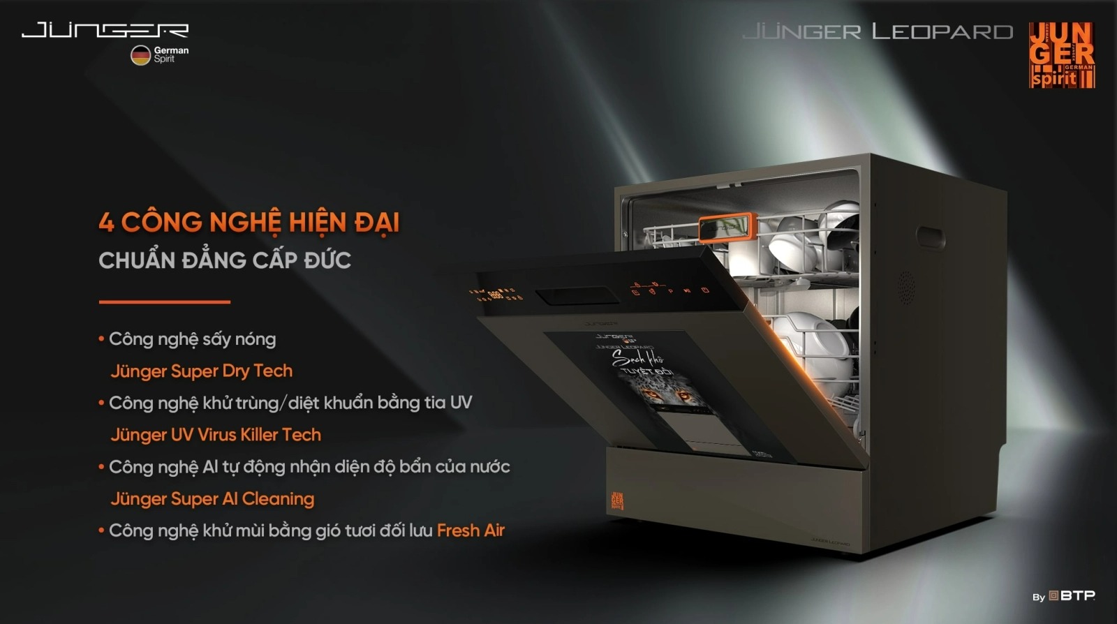 Máy rửa bát Junger Leopard không chỉ làm sạch mà còn tiệt trùng hiệu quả với công nghệ Junger UV Virus Killer Tech. Bát đĩa được rửa bằng nước nóng tới 75 độ C, kết hợp với tia UV giúp tiêu diệt tới 99,99% vi khuẩn. Ngoài ra, khử mùi bằng gió tươi đối lưu Fresh Air sẽ loại bỏ mọi mùi khó chịu, giúp chén bát sạch sẽ, thơm mát và an toàn cho trẻ nhỏ, người già và người nhạy cảm.