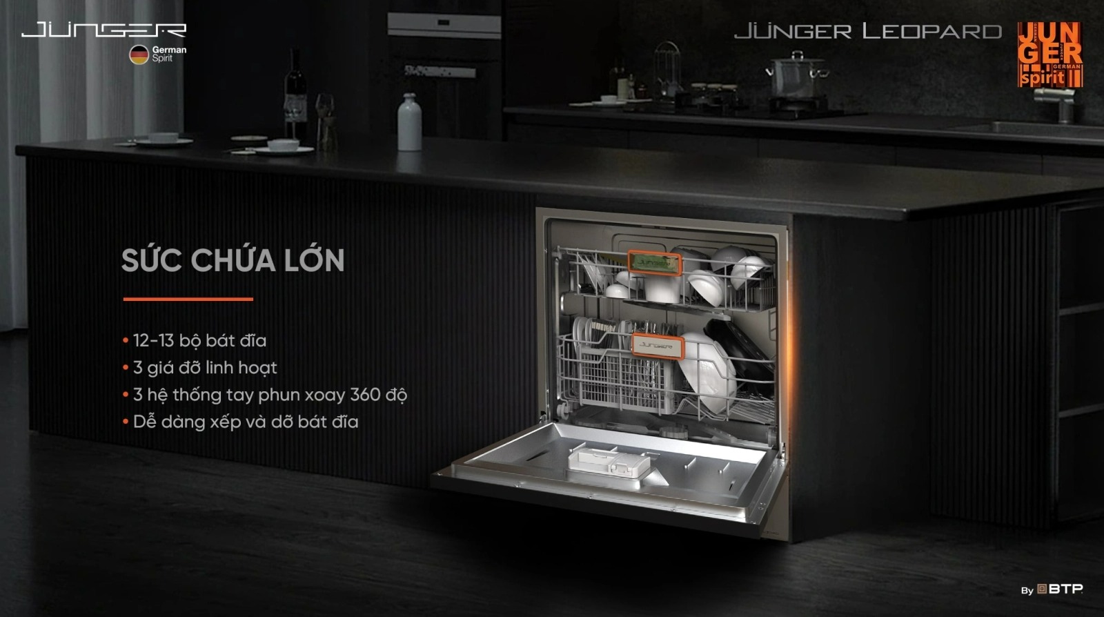 Với khả năng chứa lên tới 12–13 bộ chén đĩa châu Âu, tương đương với khoảng 3–4 bữa ăn gia đình Việt, máy rửa bát Junger Leopard là lựa chọn lý tưởng cho hộ gia đình từ 4 đến 6 người. Khoang chứa rộng, bố trí hợp lý với 3 giá đựng, giỏ chứa thìa đũa tách biệt giúp tối ưu hóa không gian, cho phép bạn xếp xoong nồi, ly tách và bát đĩa gọn gàng, hợp lý.