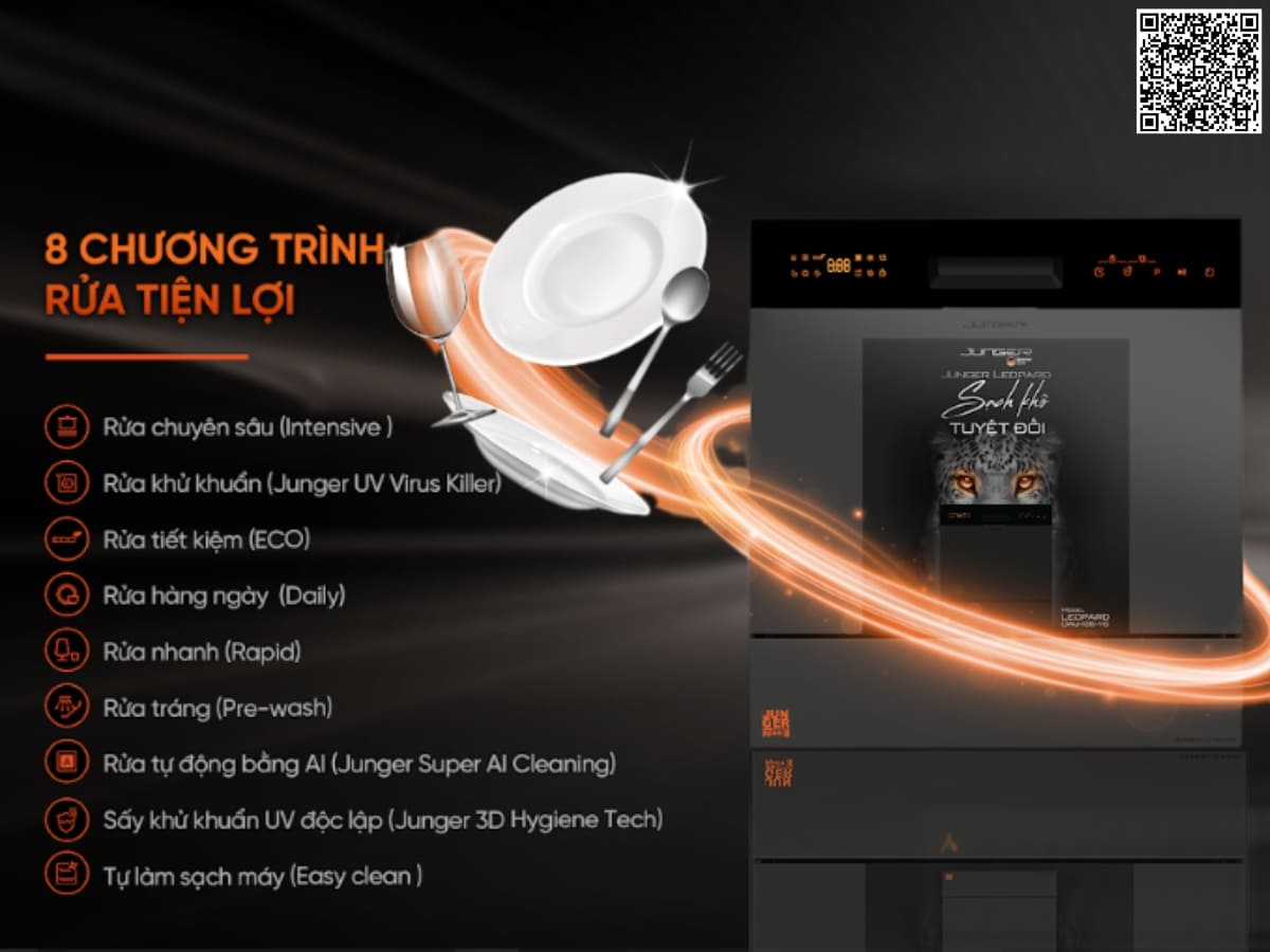 Bên cạnh công nghệ rửa và sấy hiện đại, máy rửa bát Junger Leopard DWJ-136-VG còn được trang bị 8 chương trình rửa tiện lợi, đáp ứng nhu cầu làm sạch hầu hết vật dụng nhà bếp từ cơ bản đến nâng cao.