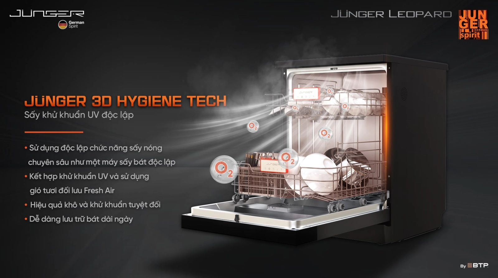 - Rửa khử khuẩn Junger UV Virus Killer: Sử dụng nước nóng 75℃, kết hợp tia UV và khử mùi bằng gió nóng đối lưu Fresh Air tiệt trùng hiệu quả 99,99% vi khuẩn cho bát đĩa và vật dụng rất bẩn.