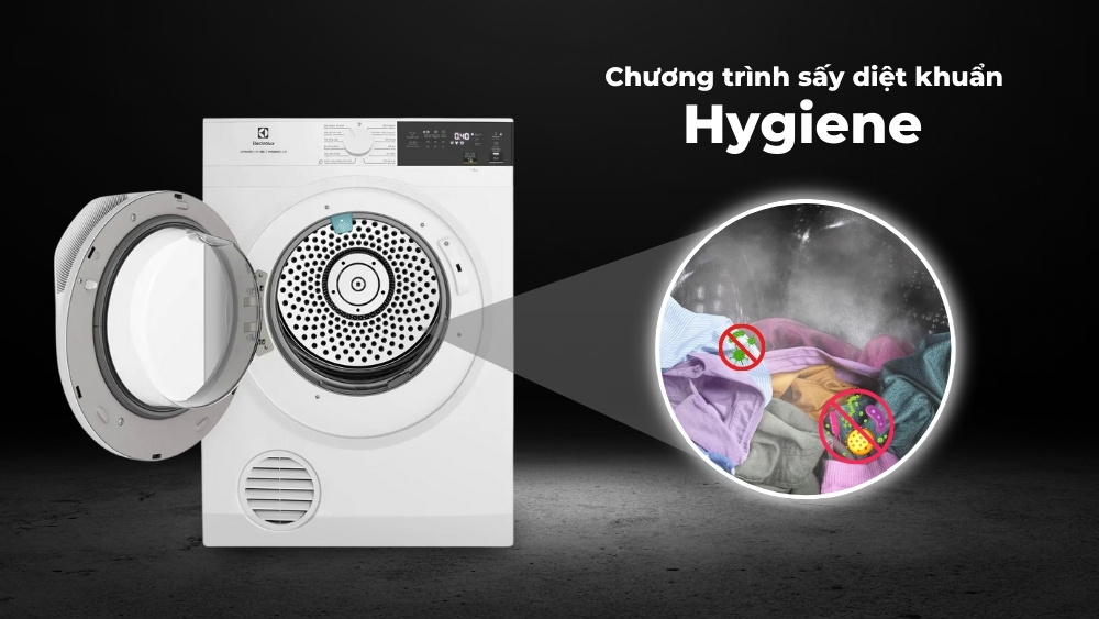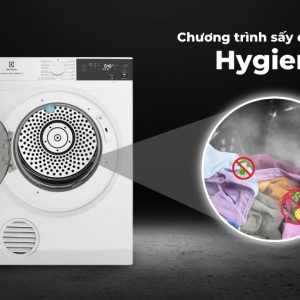 – Máy được tích hợp nhiều chương trình sấy đa dạng như sấy nhanh 40 phút, sấy đồ hỗn hợp, sấy vải tổng hợp, sấy bộ đồ giường,… Đặc biệt, chương trình sấy diệt khuẩn Hygiene giúp loại bỏ vi khuẩn, vi rút và các tác nhân gây dị ứng, phù hợp với quần áo trẻ em và người có làn da nhạy cảm.