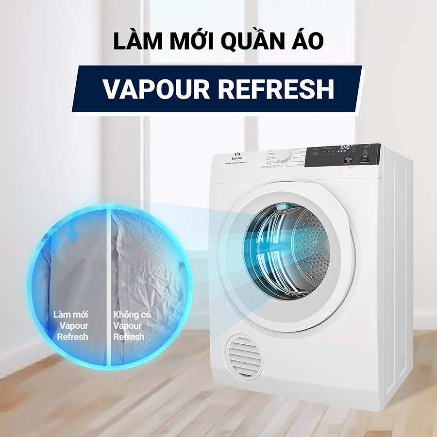 – Chương trình VapourRefresh sử dụng hơi nước nóng để thẩm thấu sâu vào sợi vải, hỗ trợ phục hồi phom dáng và làm phẳng quần áo trong thời gian ngắn, chỉ khoảng 30 phút. Nhờ sự kết hợp này, quần áo sau khi sấy luôn tươi mới, mềm mại và dễ ủi hơn, tiết kiệm thời gian cho người dùng.