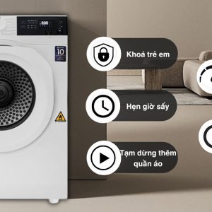 – Tính năng hẹn giờ sấy cho phép người dùng cài đặt thời điểm hoàn tất chu trình phù hợp với lịch trình sinh hoạt, hạn chế quần áo bị để lâu trong máy sau khi sấy xong.