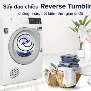 – ReverseTumbling – công nghệ sấy đảo chiều giúp quần áo xoay đều trong lồng, tránh xoắn rối và làm giảm nếp nhăn, nhờ đó việc là ủi sau sấy trở nên nhẹ nhàng hơn.