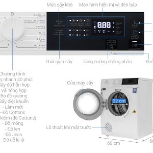 – Máy sấy sử dụng cơ chế sấy thông hơi giúp quần áo khô nhanh chóng, tiết kiệm thời gian. Người dùng nên lắp đặt máy ở không gian thoáng để luồng khí nóng ẩm có thể thoát ra ngoài dễ dàng.