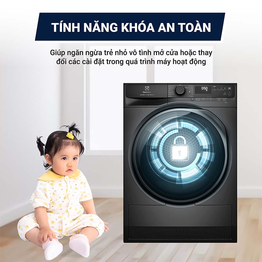 – Máy được trang bị khóa trẻ em ngăn trẻ tác động lên bảng điều khiển, đảm bảo an toàn cho trẻ.