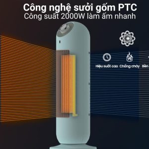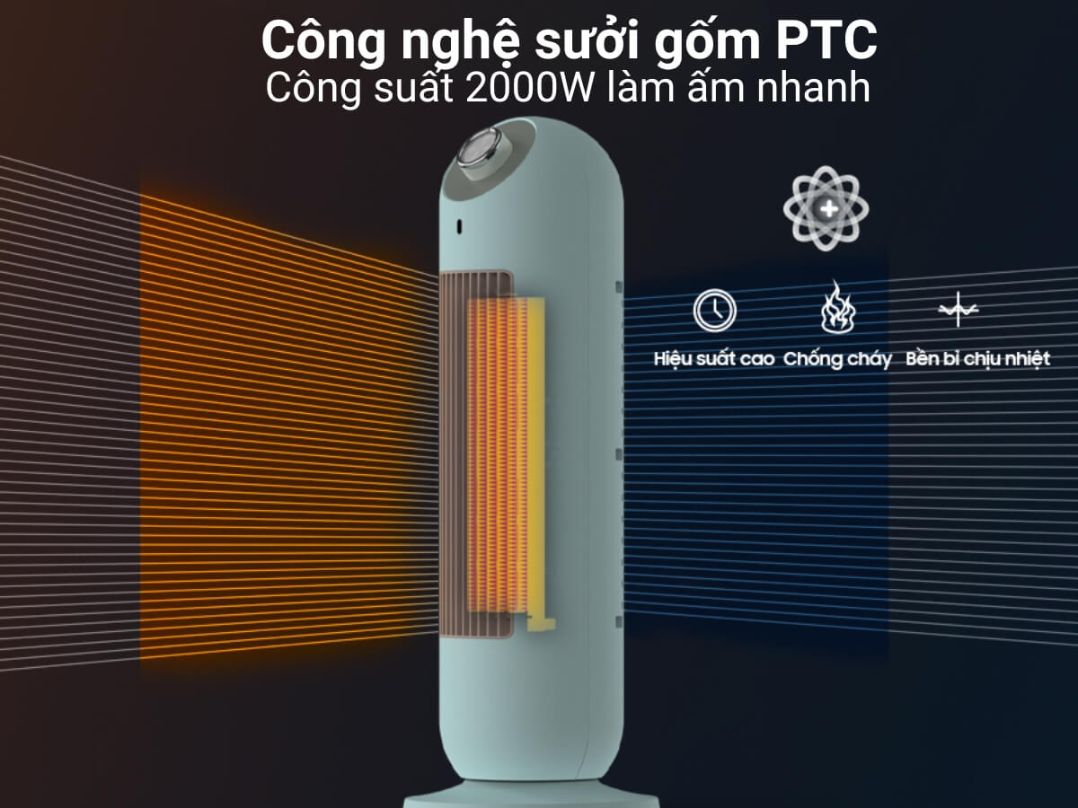 Quạt sử dụng công nghệ làm ấm bằng sưởi gốm PTC với khả năng tỏa nhiệt góc rộng, giúp nhiệt độ trong phòng tăng nhanh mà vẫn giữ được mức ổn định khi sử dụng kéo dài.