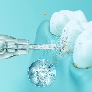 Tia nước mạnh sử dụng công nghệ siêu âm giúp loại bỏ các mảnh vụn thức ăn bám trên bề mặt răng.