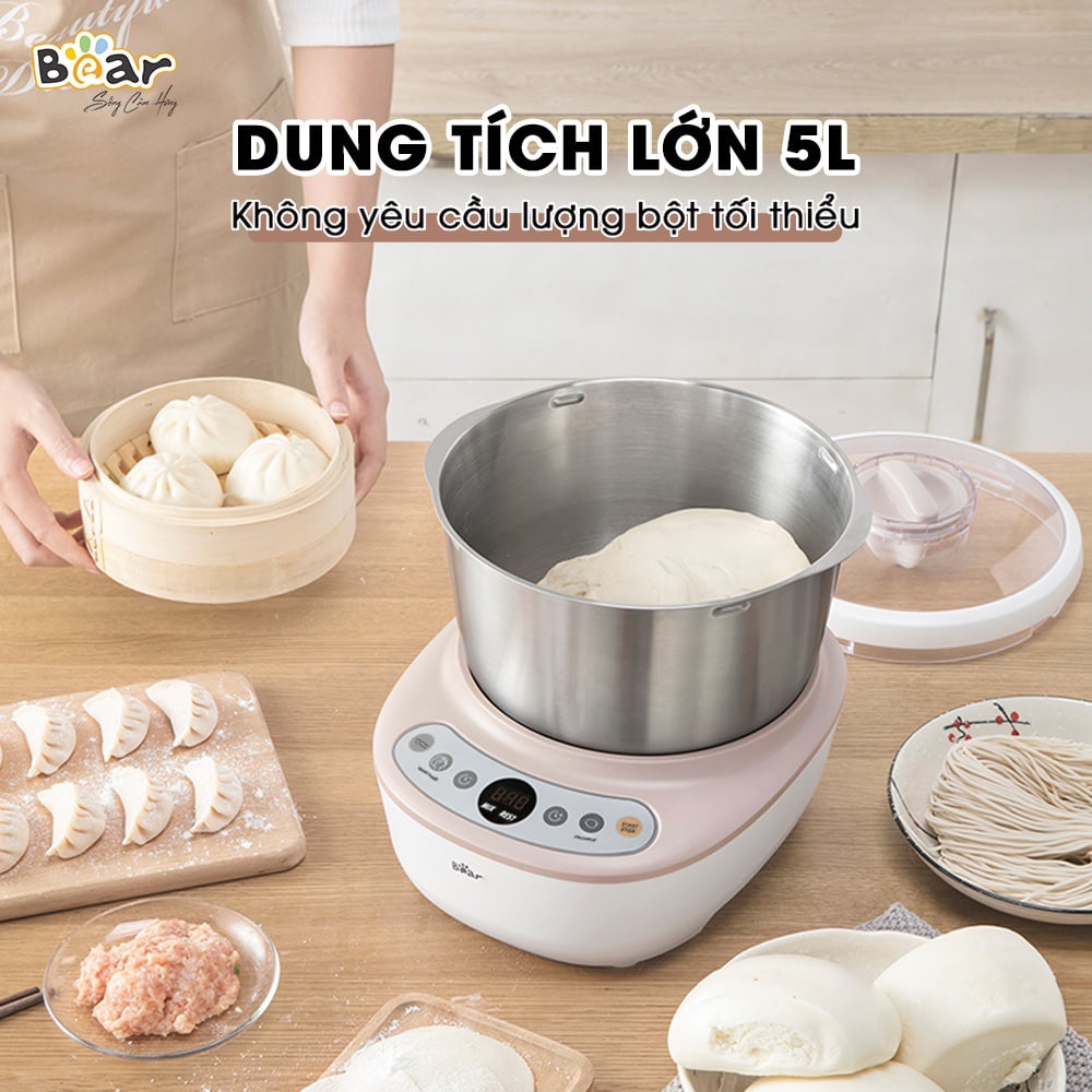 So với dòng 7L nhà Bear thì dòng máy này chỉ có 5L, đủ dùng cho gia đình từ 3 – 5 người. Máy có thể trộn từ 300 – 800g bột khô, cho ra từ 4.5 – 5kg bột thành phẩm, tương đương với 10 – 15 ổ bánh mì, 25 – 125 vỏ sủi cảo, từ 2 – 10 bát mì tươi… bấy nhiêu là đã đủ cho cả gia đình thưởng thức.
