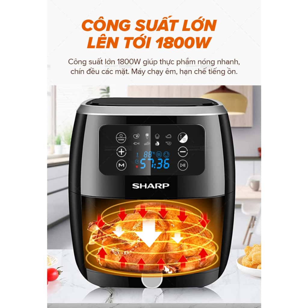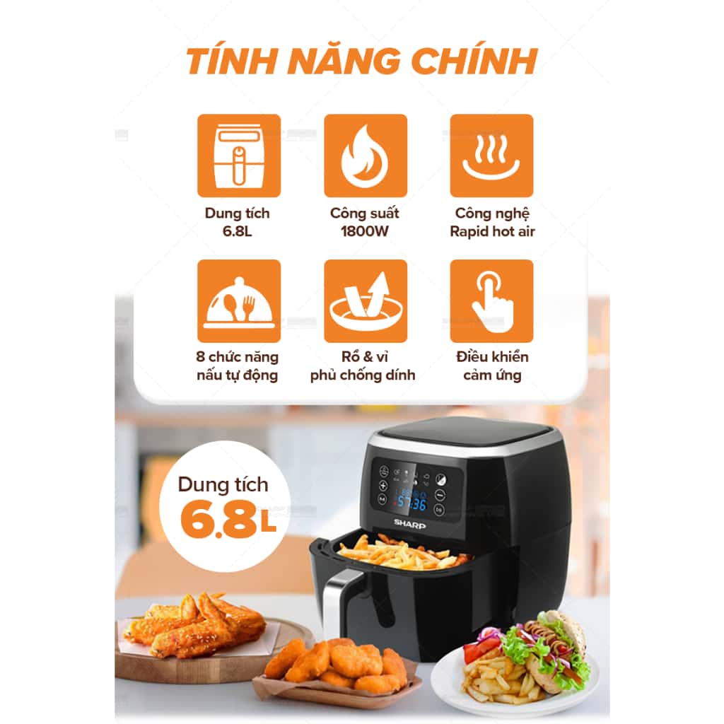 Trong đó, Rapid Air là công nghệ giúp lưu thông tuần hoàn các luồng khí nóng nhờ đó thực phẩm chó thể chính nhanh hơn. Bên cạnh đó lò nướng không dầu Sharp KF-AF68EPV-BK còn được trang bị tới 8 chức năng tự động khác nhau như chiên khoai tây, chiên thịt, chiên gà.