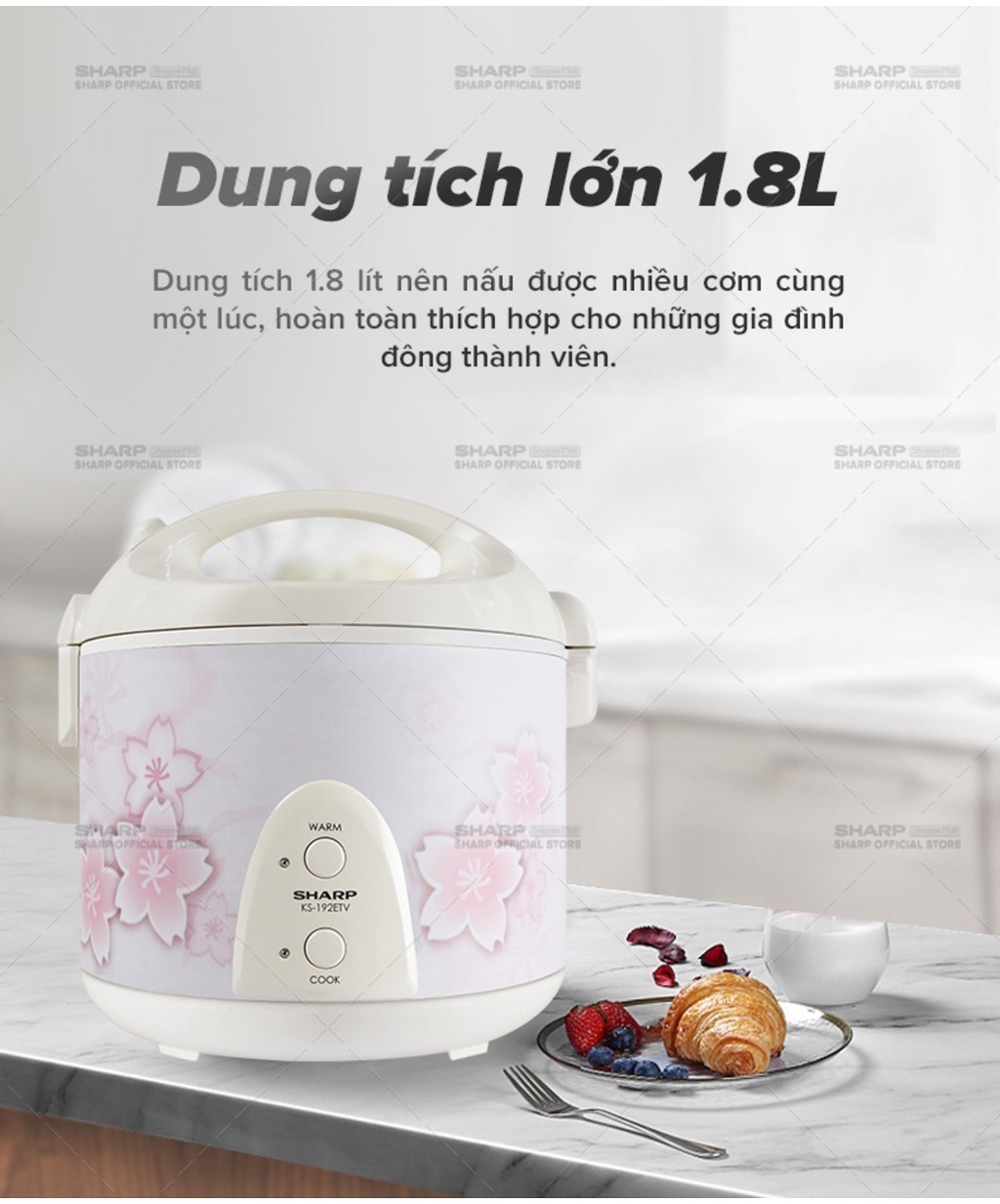 Nồi cơm điện KS-N192ETV “SP” có dung tích 1.8 lít đáp ứng nhu cầu của nhiều người tiêu dùng, phù hợp cho các bữa ăn gia đình hàng ngày có từ 4 – 6 thành viên.