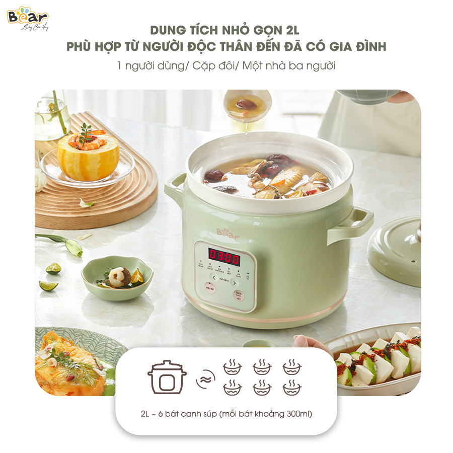 Thương hiệu Bear luôn chú trọng trong từng chi tiết thiết kế: tay cầm chống bỏng – thân nồi dễ vệ sinh – thố sứ chống trào. Dung tích nồi nhỏ gọn 2L dành cho người độc thân, cặp đôi, người đã có gia đình, nhà có trẻ con,… Sắc màu xanh nhạt của nồi giúp không gian bếp của bạn thêm phần nổi bật.