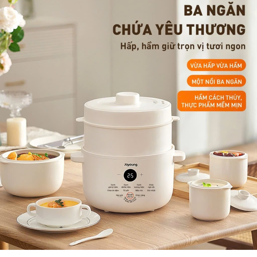 Nồi nấu chậm Joyoung JSC-187 có thiết kế 2 ngăn (ngăn hầm và ngăn hấp) cùng với 3 nồi hầm có dung tích từ 0.5 – 1.8 lít, giúp người dùng hoàn thành bữa ăn đơn giản gồm 2 – 3 món khác nhau trong cùng 1 lúc.
