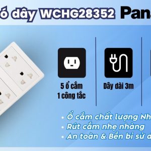 Ổ cắm có dây Panasonic WCHG28352 là loại 5 ổ cắm cùng với 1 công tắc có đèn báo đỏ. Công tắc có tác dụng bật/tắt nguồn điện của 5 ổ cắm trên thiết bị mà không cần rút phích cắm ra khỏi nguồn điện, đồng thời đèn báo trên công tắc giúp người sử dụng dễ dàng nhận biết được khi nào ổ cắm có điện hoặc không có điện. Sản phẩm được thiết kế với màu trắng tinh tế – trang nhã, WCHG28352 có dây dài 3m cùng đầu phích cắm lớn an toàn và dễ dàng cho người sử dụng.