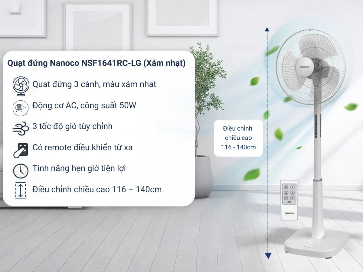 Quạt cây Nanoco này có thể tùy chỉnh độ cao linh hoạt để phù hợp sử dụng cho nhiều vị trí, mục đích khác nhau của người dùng.