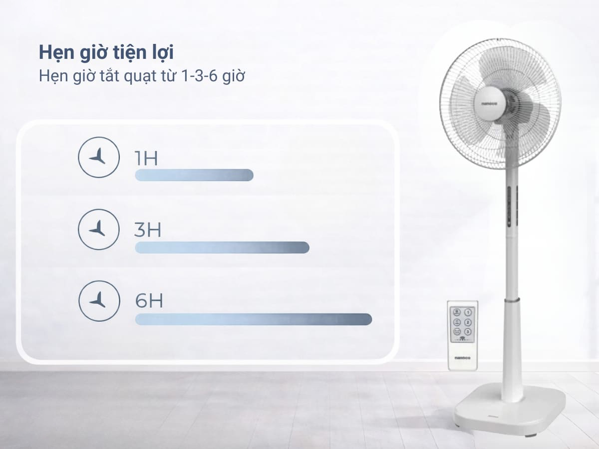 Nanoco NSF1641RC tích hợp cả phím bấm cơ và điều khiển từ xa, giúp người dùng điều chỉnh quạt dễ dàng mà không cần di chuyển. Ngoài ra, tính năng hẹn giờ linh hoạt 1 – 3 – 6 giờ trên chiếc quạt này cũng rất tiện lợi khi sử dụng vào ban đêm, đặc biệt giúp tiết kiệm điện năng khi không cần quạt chạy liên tục.