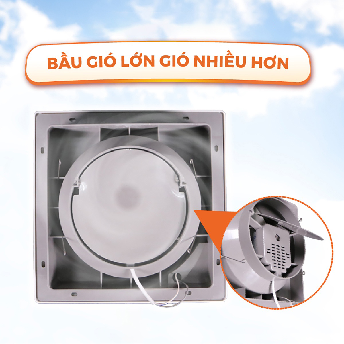 - Ưu điểm về thiết kế: Thiết kế góc côn gió từ mọi hướng giúp dễ dàng thông gió. Bầu gió có đường kính và độ sâu lớn tăng cường lưu lượng không khí và giảm tiếng ồn. Mặt lưới với các lỗ lớn giúp thông gió một cách dễ dàng. Ốc vít được đặt ở mặt sau mang lại tính thẩm mỹ cao.