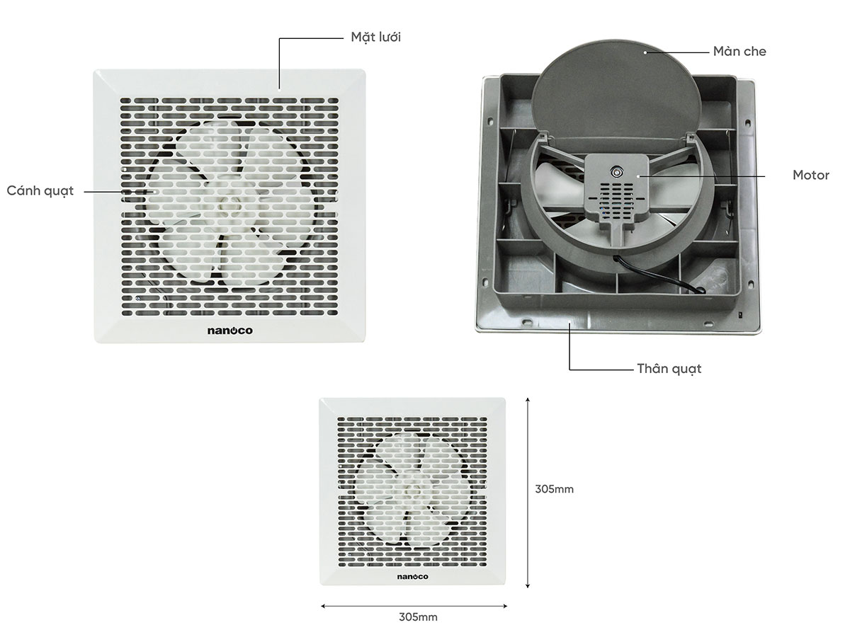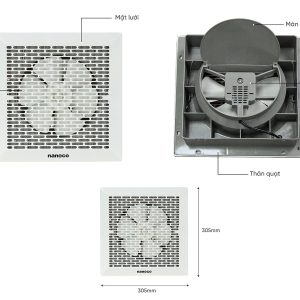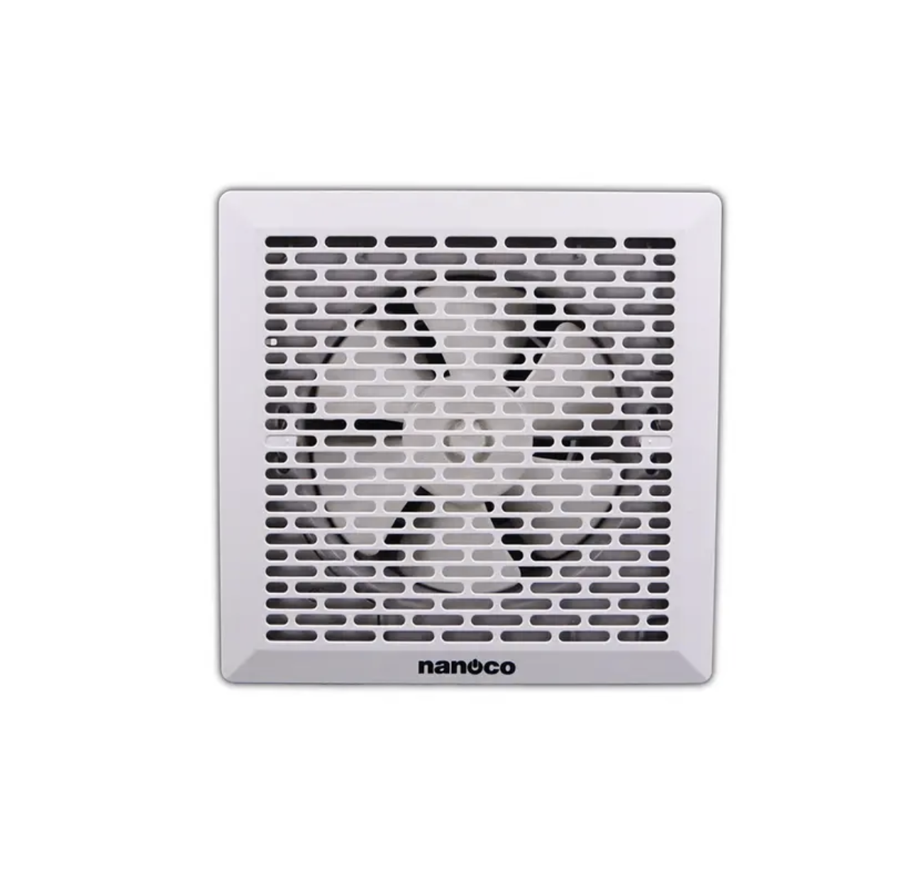 Quạt thông gió Nanoco được trang bị công suất 24W, mức tiêu thụ điện tương đối thấp, phù hợp với nhu cầu sử dụng thường xuyên trong gia đình hoặc văn phòng nhỏ. Với lưu lượng gió đạt khoảng 400 m³/h, thiết bị có khả năng hỗ trợ luân chuyển không khí trong không gian kín, góp phần giảm cảm giác bí bách và hạn chế tình trạng tích tụ mùi hoặc độ ẩm.