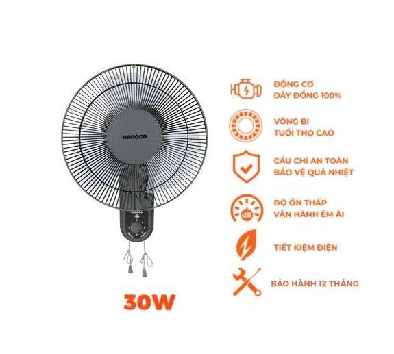 Nanoco NWF1218GR có thiết kế treo tường tiết kiệm không gian, màu ghi trang nhã, phù hợp với mọi phong cách nội thất. Đường kính cánh 30cm cho phạm vi làm mát rộng, mang lại sự dễ chịu trong những ngày hè oi bức.